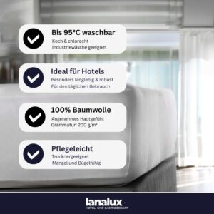 Strapazierfähig und einfach zu pflegen Mit einer Grammatur von 200 g/m² ist dieses Spannbettlaken robust und den Anforderungen des Hotelalltags gewachsen. Die hochwertige Baumwolle ermöglicht eine einfache Pflege – das Laken ist trocknergeeignet und bei bis zu 90°C waschbar.